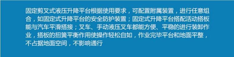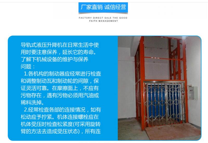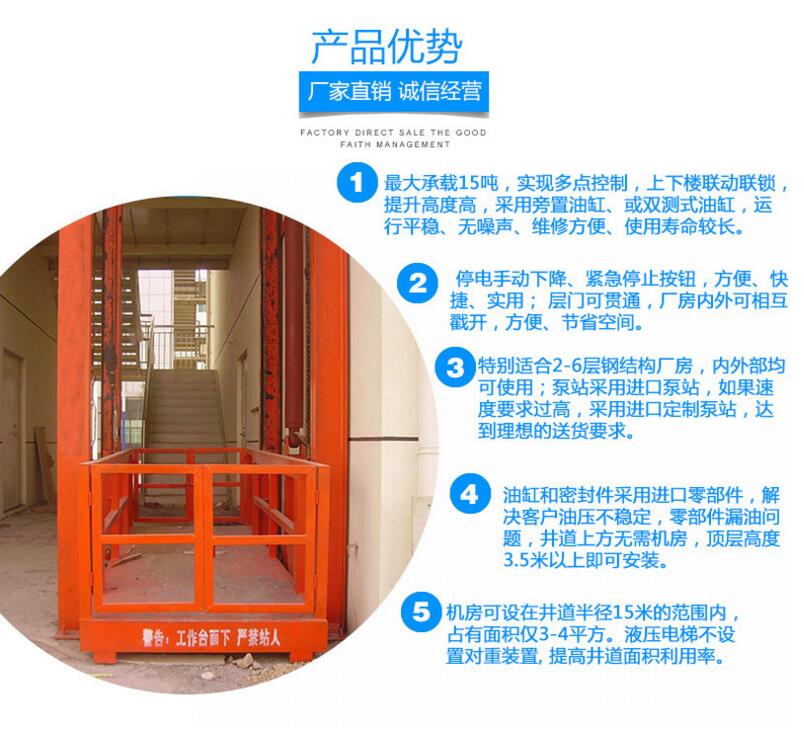 導(dǎo)軌升降平臺(tái)可承載30噸,實(shí)現(xiàn)多點(diǎn)控制,上下樓層互動(dòng)聯(lián)鎖,達(dá)到***使用;現(xiàn)多點(diǎn)控制,上下樓層互動(dòng)聯(lián)鎖,達(dá)到***使用;提升高度高,采用旁置油缸、或雙測式油缸,運(yùn)行平穩(wěn)、無噪聲、維修方便、使用壽命較長;停電手動(dòng)下降、緊急停止按鈕,方便、快捷、實(shí)用; 地坑深度一般為15cm-30cm,頂層高度不受限制,可根據(jù)現(xiàn)場環(huán)境定做用;層門可貫通,廠房內(nèi)外可相互戳開,方便、節(jié)省空間;特別適合2-3層鋼結(jié)構(gòu)廠房,內(nèi)外部均可使用;泵站采用進(jìn)口泵站,如果速度要求過高,采用進(jìn)口定制泵站,達(dá)到理想的送貨要求,油缸和密封件采用進(jìn)口零部件,解決客戶油壓不穩(wěn)定,零部件漏油問題,電器零部件可選,(上海人民電器、法國施耐德、德國西門子)