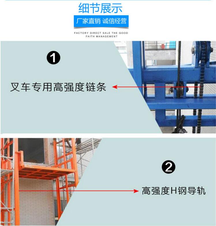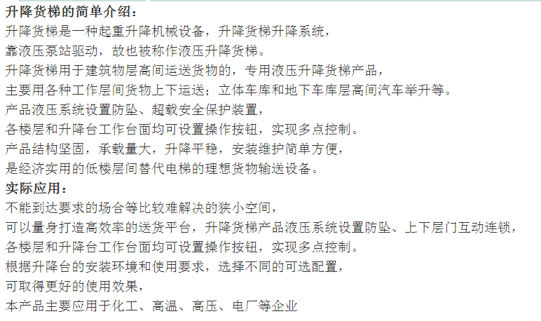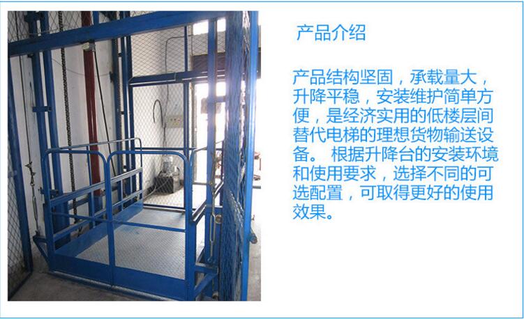 導(dǎo)軌式升降機(jī)結(jié)構(gòu)堅(jiān)固,承載量大,升降平穩(wěn),安裝維護(hù)簡單方便,是經(jīng)濟(jì)實(shí)用的低樓層間替代電梯的理想貨物輸送設(shè)備。根據(jù)升降臺(tái)的安裝環(huán)境和使用要求,選擇不同的可選配置,可取得更好的使用效果.